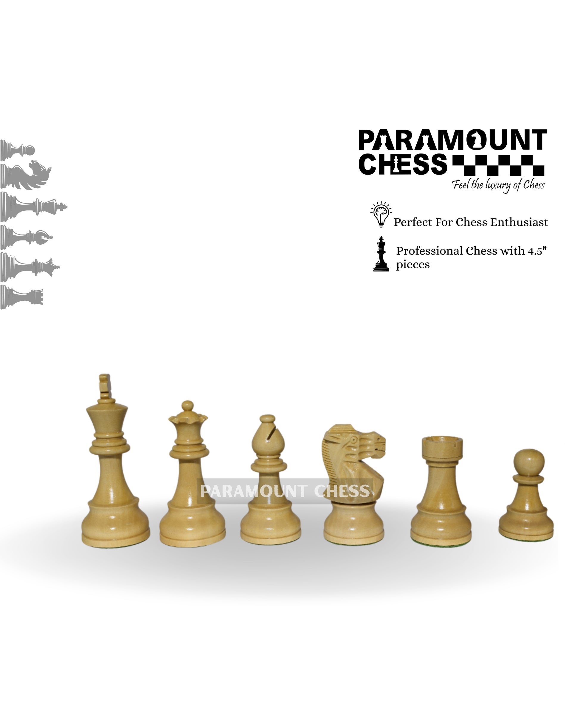 Elevate your chess experience with our 4.5-inch Supreme Staunton Wooden Chess Pieces, paired with an elegant 21-inch Grandmaster Chess Board. Designed for serious players and collectors, this set exemplifies classic Staunton proportions, exceptional balance, and premium craftsmanship.